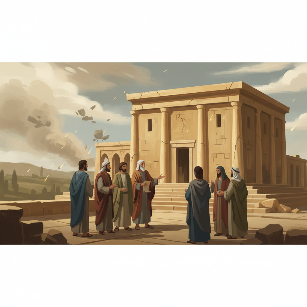 有些人正談論聖殿是用美麗的石頭,和還願的獻品裝飾的,耶穌說:「你們所看見的這一切,待那時日一到,沒有一塊石頭留在另一塊石頭上,而不被拆毀的。」