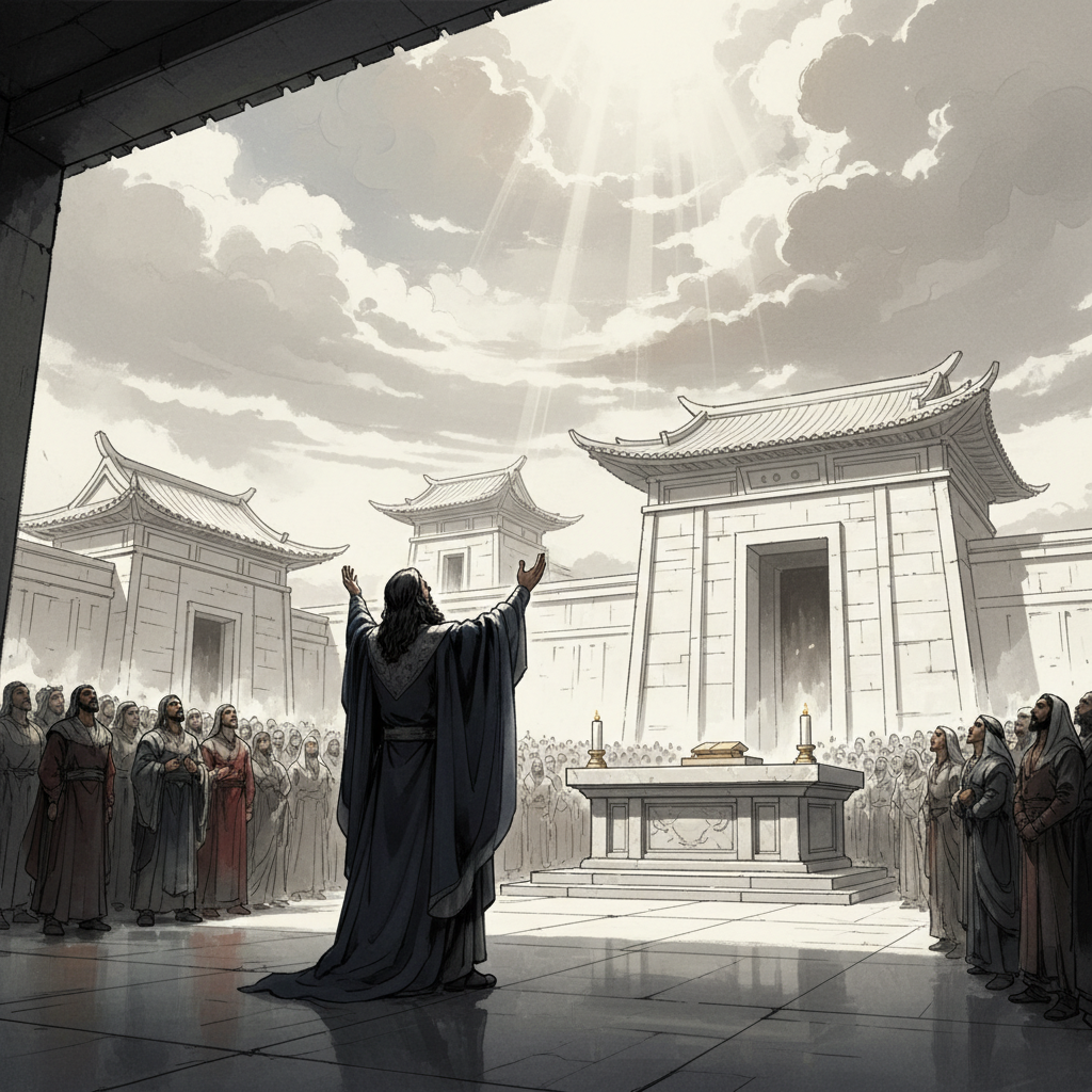 那時候,撒羅滿當著以色列全會眾,立在上主的祭壇前,舉手向天,說:「上主,以色列的天主!上天下地沒有一個神能與祢相比。祢對那全心在祢面前行走的僕人,常是守約表示慈愛。但是,天主實在住在地上嗎?看,天和天上的天尚且容不下祢,何況我所建造的這座殿宇呢?上主,我的天主,請垂允祢僕人的祈禱和懇求,俯聽祢僕人今天在祢面前所發的呼號和祈禱!願祢的眼睛晝夜垂視這座殿宇,看顧祢所說『我的名要永留在此』的地方!願祢垂聽祢僕人向這地方要行的祈禱!願祢垂聽祢僕人和百姓以色列向這地方所發的哀禱!願祢在天上,從祢的居所予以垂聽!請垂聽與寬恕!」