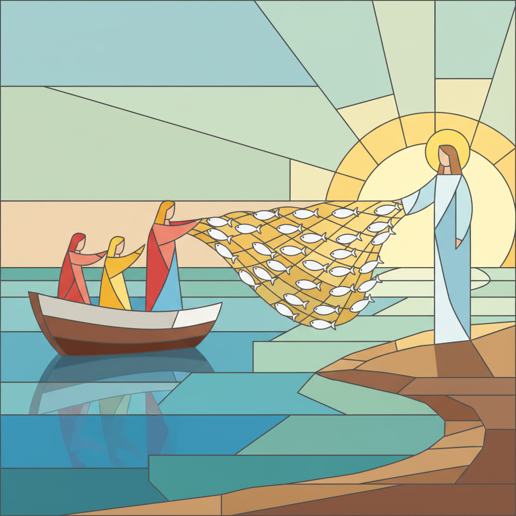 在今天的福音中,復活後的耶穌在提庇黎雅海邊,向一群正在打魚卻一無所獲的門徒顯現。福音說,門徒們「那一夜什麼也沒捕到」。這句話是否也像在描述我們的生活?我們努力工作,卻看不到成果;為家庭付出,卻感到不被理解;在信仰上盡力祈禱,卻覺得天主好像沉默。門徒曾親眼見過復活的主,但回到日常生活時,依然迷惘、疲憊、失望。這提醒我們:即使是有信德的人,也會有「空網」的時候。不只在日常生活中,在堂區裡我們也會有「空網」的經驗。有些教友長年擔任不同職務,如讀經、送聖體、打掃聖堂、主日學老師或合唱團團員,但可能多年來沒人稱讚、賞識、感謝,這讓人不禁懷疑:「這樣服務,真的有意義?」福音描述天亮的時候,耶穌站在岸上,但門徒卻「沒有認出是耶穌」。很多時候,主就在我們身邊,但我們無法認出祂來。在我們的堂區與生活中,耶穌其實常透過很平凡的方式出現,如彌撒讀經的一句聖言、神父講道中的一句話、修女的一個微笑、一位教友的問候、或是一則表達感謝的訊息。你可以問問自己:最近,有沒有人在不經意中關心我?我是否願意把那當成主的回應?生活中即使壓力籠罩,復活的主依然站在岸上,祂正溫柔地對你說:「孩子,把網再撒一次吧!」願我們在平凡的堂區生活與每天的勞碌中,一次又一次,重新遇見復活的主。